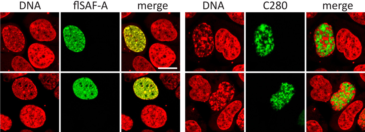Image: SAF-A is essential for the functional architecture of the cell nucleus. Left panels show that full length wildtype SAF-A and bulk chromatin co-localize in the nucleus, while the right panels show how a dominant negative construct of SAF-A, called C280, leads to a global collapse of chromatin structure. Each panel shows one transfected cell and no-transfected neighboring cells for control. Note how C280 and collapsed chromatin are mutually exclusive.